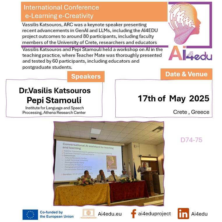 Vassilis Katsouros, ARC was a keynote speaker presenting recent advancements in GenAI and LLMs, including the AI4EDU project outcomes to around 80 participants, including faculty members of the University of Crete, researchers and educators.